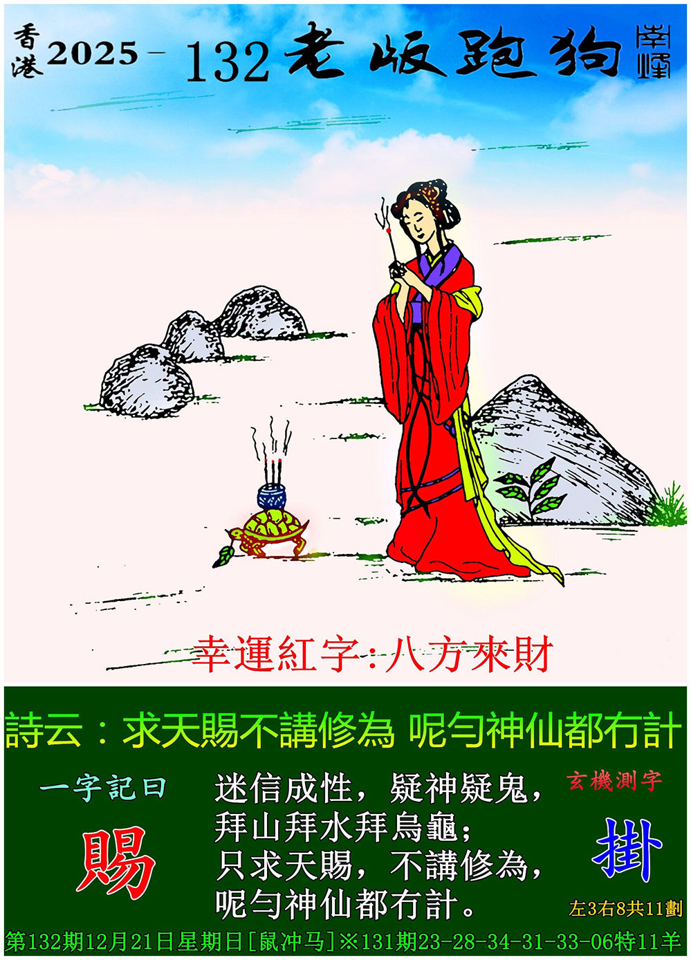 | 主题 :132期老版跑狗一字記之曰:【賜】 玄機測字:《掛》 |