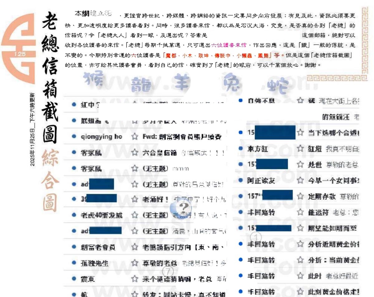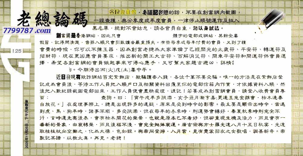 | 主题 :125期:六合皇金句/老总论码/萧公子/林大师/五行夺码/老总信箱截 |