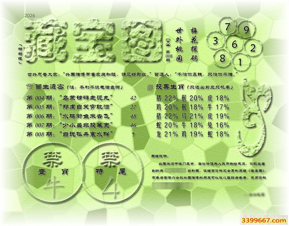 | 主题 :008期藏寶圖 新:清晓起来无个事 老:自说孤舟寒水畔 禁:牛 禁:4尾 |