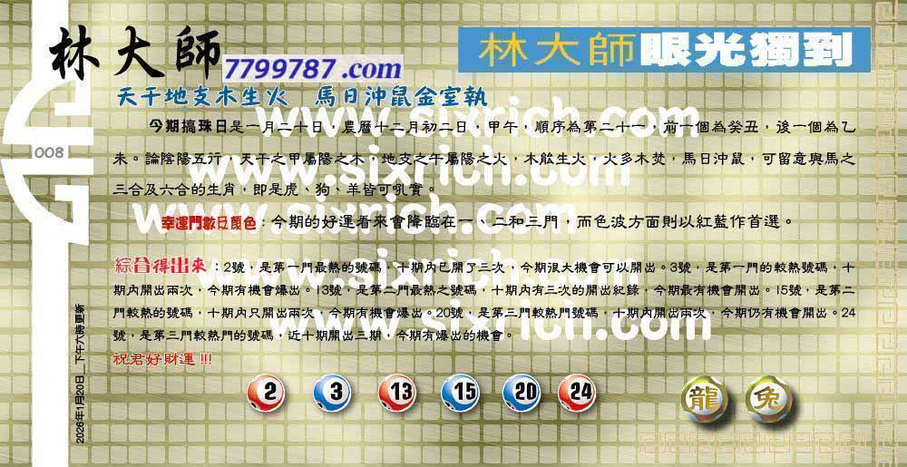 | 主题 :008期:六合皇金句/老总论码/萧公子/林大师/五行夺码/老总信箱截 |