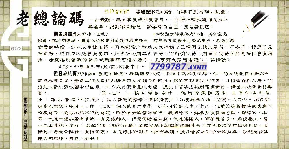 | 主题 :010期:六合皇金句/老总论码/萧公子/林大师/五行夺码/老总信箱截 |