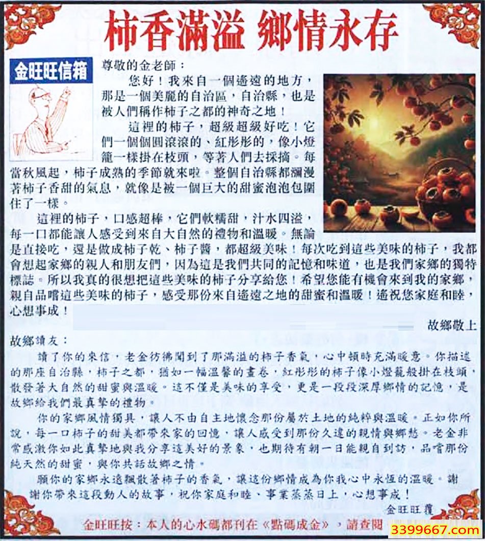 | 主题 :078期:金旺旺信箱彩民推荐→→《柿香滿溢 鄉情永存》 |