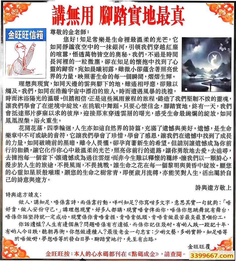 | 主题 :107期:金旺旺信箱彩民推荐→→《讲无用 脚踏实地最真》 |