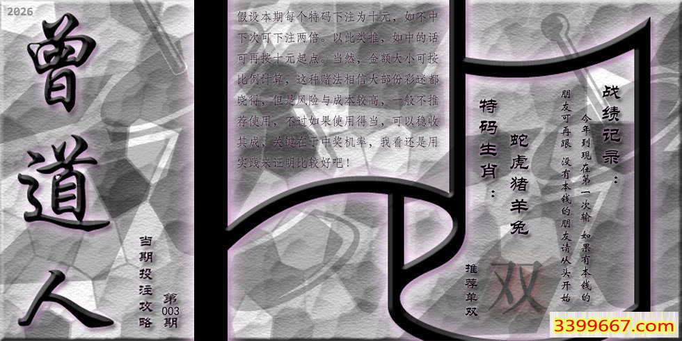 | 主题 :003期藏寶圖 新:君今旧隐治叁泾 老:交游相见休相问 禁:狗 禁:3尾 |