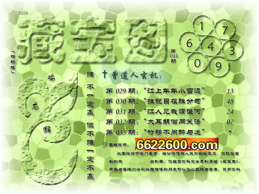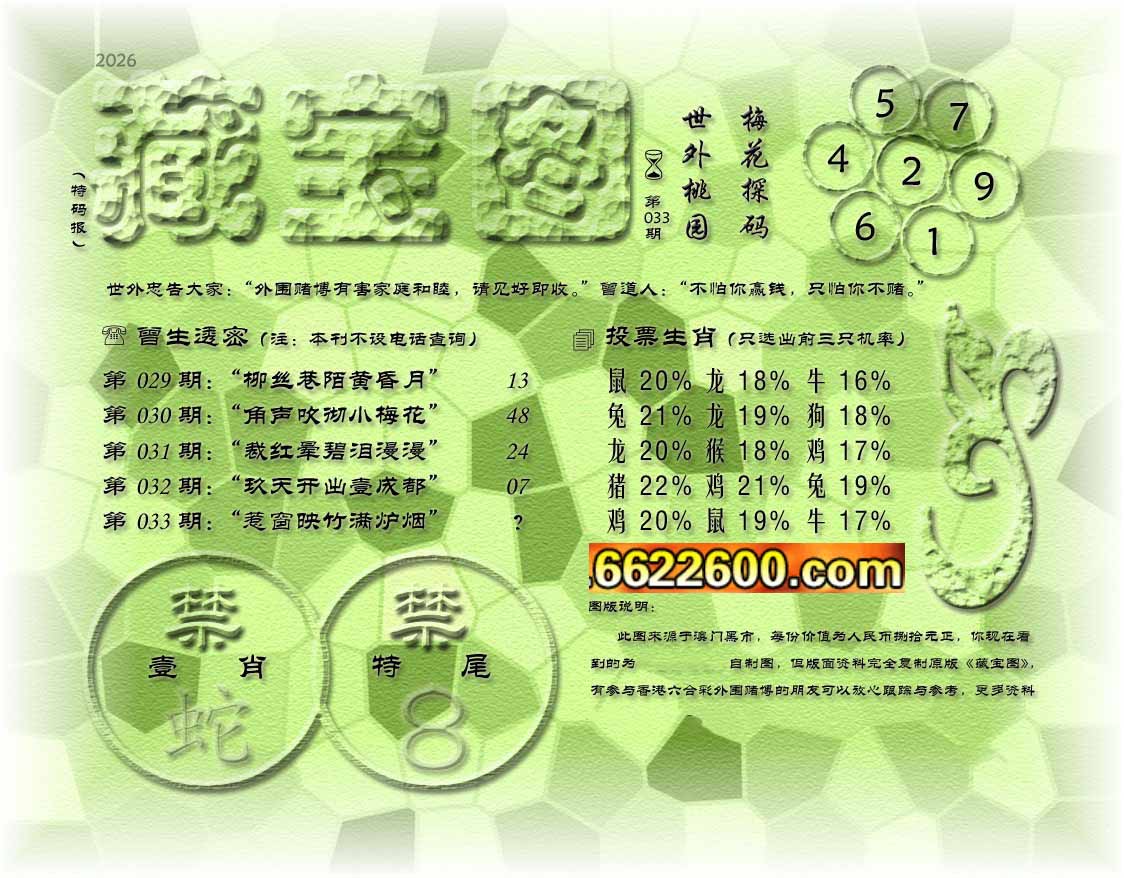 主题 : 033期藏寶圖 新:竹移不问醉与迷 老:惹窗映竹满炉烟 禁:蛇 禁:8尾 玄機字:《要》