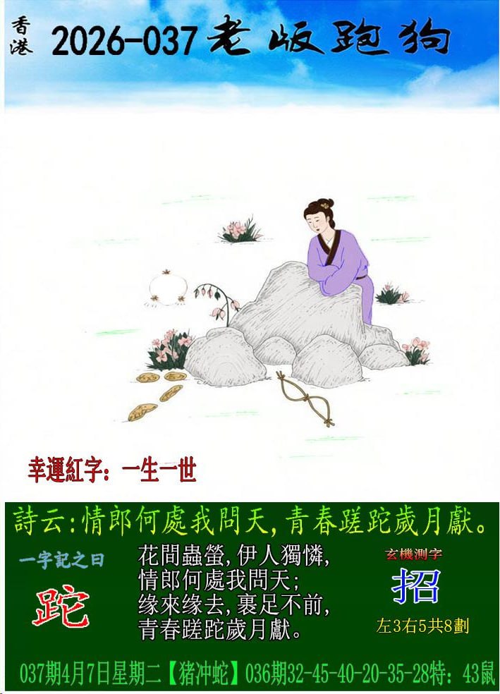 主题 : 037期老版跑狗一字記之曰:【跎】 玄機測字:《招》